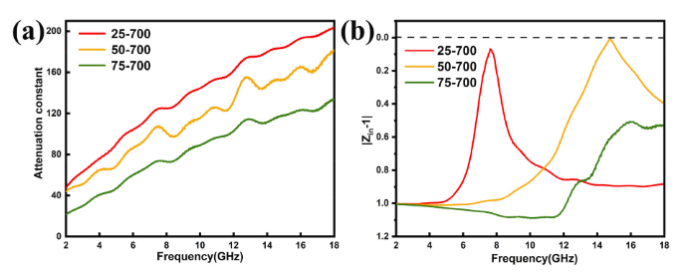 圖6. (a) PCM-25-700、PCM-50-700和PCM-75-700的衰減常數(shù)(α), (b) PCM-25-700、PCM-50-700和PCM-75-700的阻抗匹配。