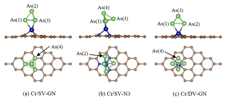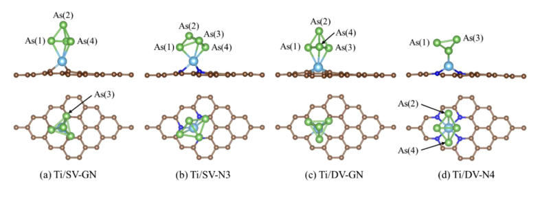 4在不同碳基單原子Ti/V/Cr/Mn吸附劑(氮原子摻雜、單空位和雙空位)表面的吸附特性。分析了單原子吸附劑的幾何形狀、吸附構(gòu)型、吸附能、電子結(jié)構(gòu)、電子密度等數(shù)據(jù)。通過對(duì)比分析16種吸附劑的計(jì)算結(jié)果,發(fā)現(xiàn)雙缺氮摻雜基底的催化劑具有較高的穩(wěn)定性。通過對(duì)電荷轉(zhuǎn)移和態(tài)密度的分析,發(fā)現(xiàn)單原子吸附劑催化劑對(duì)As