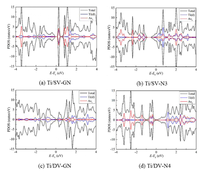 圖10. 四種不同Ti/GS吸附體系的PDOS吸附曲線。