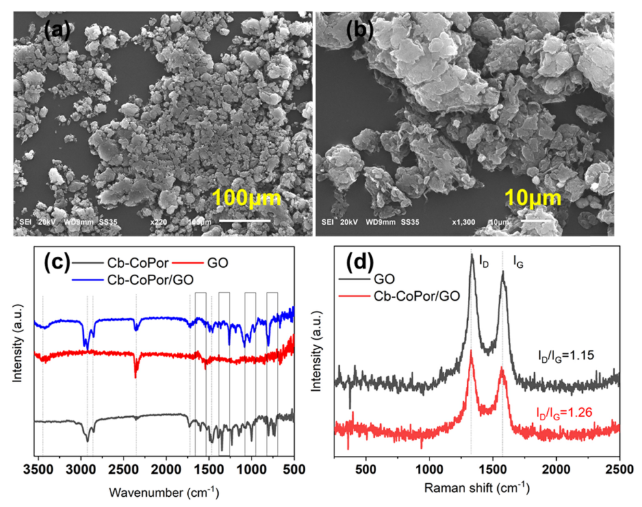 圖2. (a)和(b) Cb-CoPor/GO不同尺度(100 μm和10 μm)的SEM圖像,(c) Cb-CoPor、GO和Cb-CoPor/GO的紅外光譜,(d) GO和Cb-CoPor/GO的拉曼光譜。