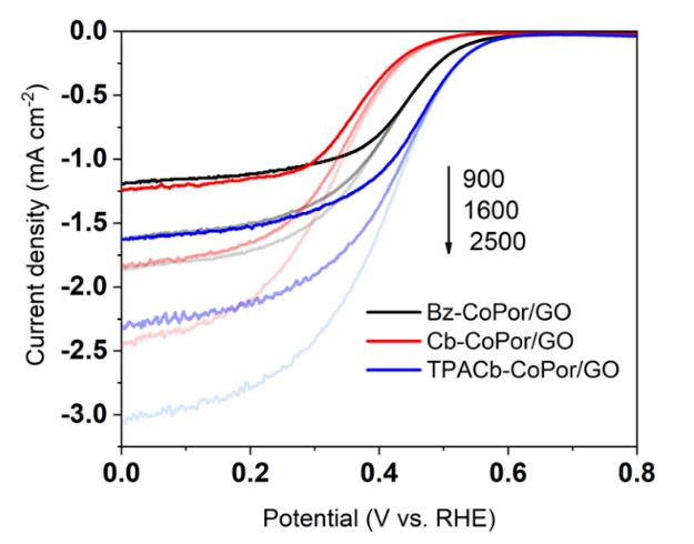 選取三種對稱鈷卟啉,其中位分別為芐基、三苯胺咔唑和咔唑,分別被命名為Bz-CoPor、Cb-CoPor和TPACb-CoPor,涂覆在氧化石墨烯(GO)上作為電催化劑,考察取代基對氧還原反應(yīng)(ORR)的影響。復(fù)合材料的光譜表征表明,卟啉與GO之間存在較強的電子耦合。通過一系列電化學(xué)測量研究了卟啉對ORR的取代效應(yīng),表明在酸性介質(zhì)中卟啉的結(jié)構(gòu)對還原電位、擴散限制電流密度、電子轉(zhuǎn)移數(shù)以及H