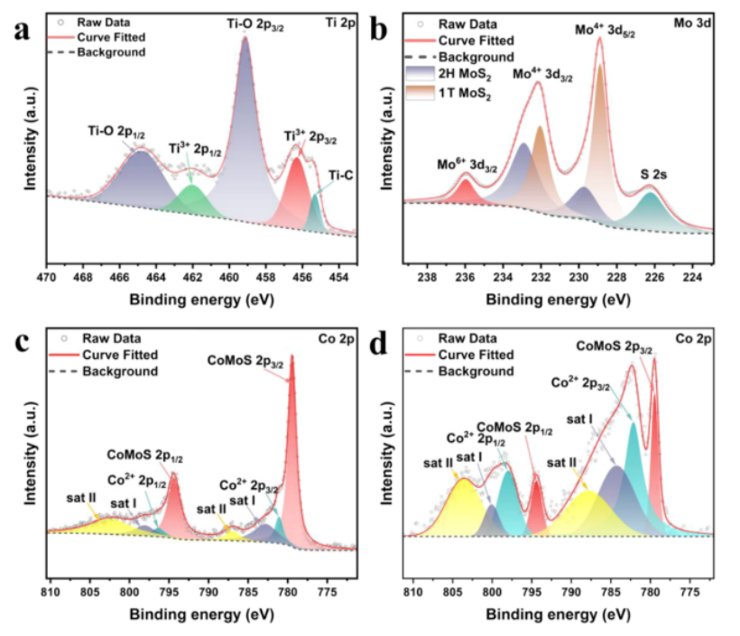 2的Ti 2p, (b) Mo 3d和(c) Co 2p;(d) CoMoS2-200的Co 2p。
