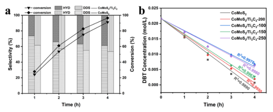 2-200上的DBT轉(zhuǎn)化率和HYD/DDS選擇性。(b) DBT濃度數(shù)據(jù)與CoMoS