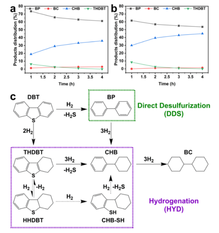 2催化的產(chǎn)物分布數(shù)據(jù)vs反應(yīng)時間。(c) DBT HDS反應(yīng)步驟。