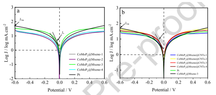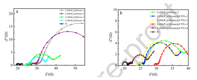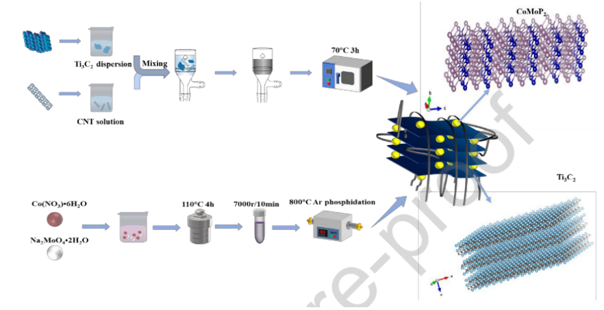 2和Mxene最佳比例的戰(zhàn)略混合材料,同時(shí)采用CNTs抑制Mxene層之間的團(tuán)聚和重復(fù)疊加,從而在Mxene中形成柱狀效應(yīng)。CoMoP