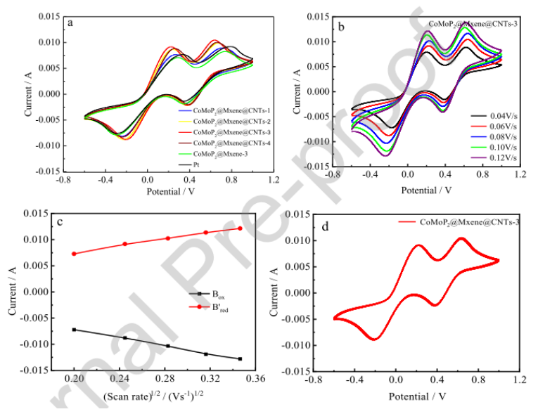 2@Mxene@CNTs-3 CEs在不同掃描速率下的cv;(c) CoMoP