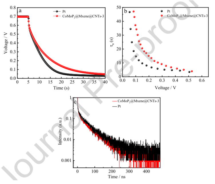 圖8. (a)開(kāi)路電壓衰減曲線;(b)計(jì)算電子壽命;(c)基于Pt和CoMoP