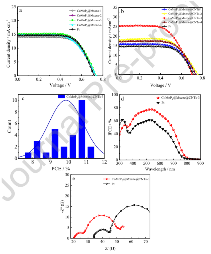 圖9. (a, b)不同CEs下DSSCs的光電流密度-電壓曲線;(三)按CoMoP