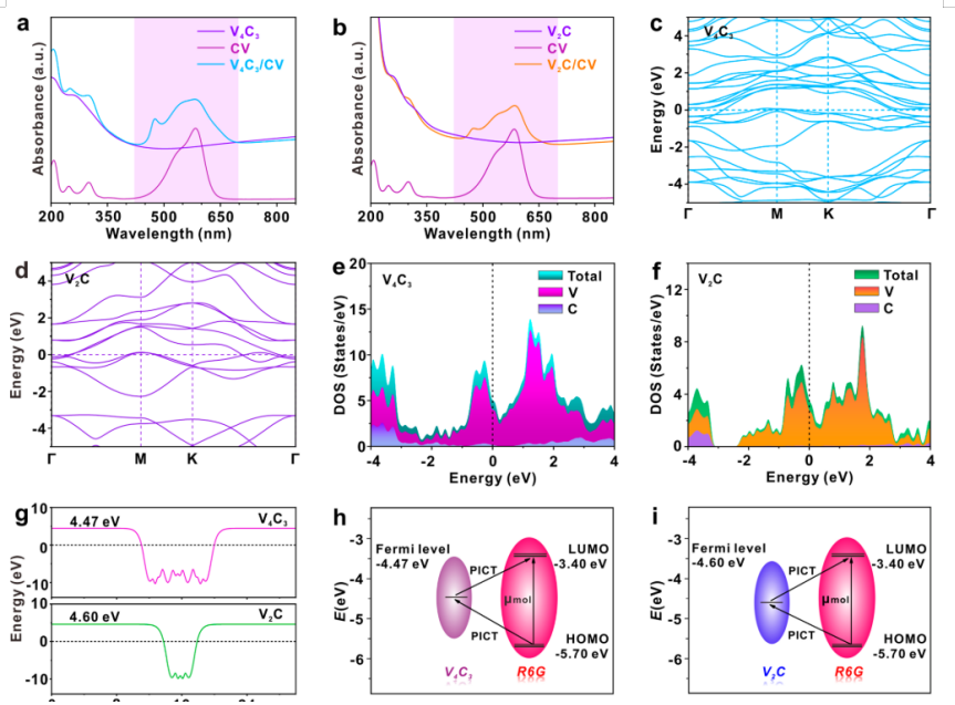 圖4. 碳化釩、CV分子和經(jīng)CV修飾的碳化釩的紫外-可見吸收光譜:(a) V