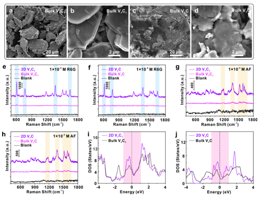 −4 M)吸附在2D和大塊碳化釩MXenes上的af拉曼光譜:(g) V