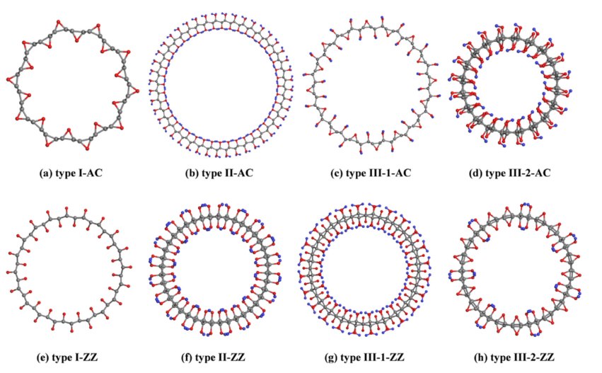 圖2. 管模型顯示了在4%拉伸應(yīng)變下沿AC和ZZ方向的氧化石墨烯的彎曲。