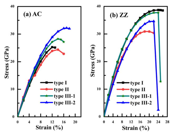 圖3. 三種GO構(gòu)型沿(a)AC和(b)ZZ方向拉伸的應(yīng)變-應(yīng)力曲線。