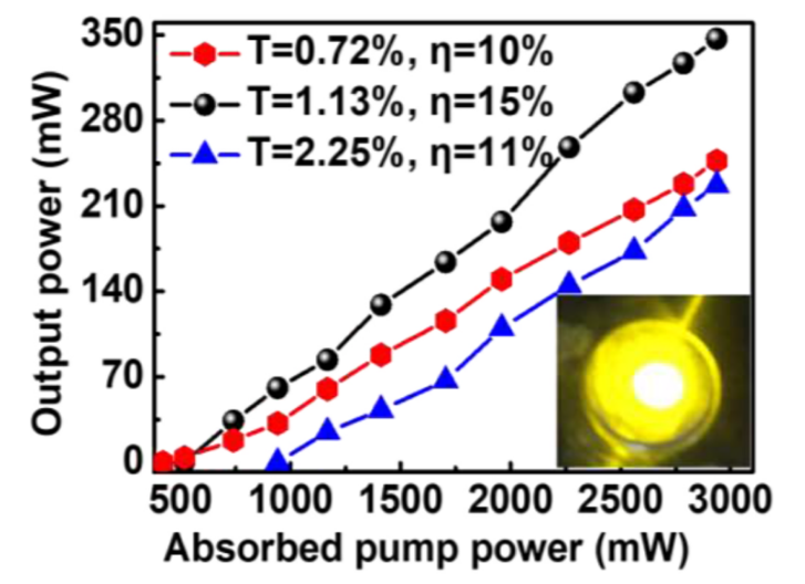 圖2. 輸出功率與連續(xù)波操作中吸收的泵浦功率(插圖:黃色激光照片)。