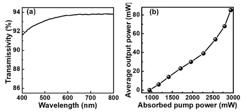 圖4. (a)單層石墨烯飽和吸收體的透射譜;(b)調Q激光器運行時輸出功率與吸收泵功率的關系。
