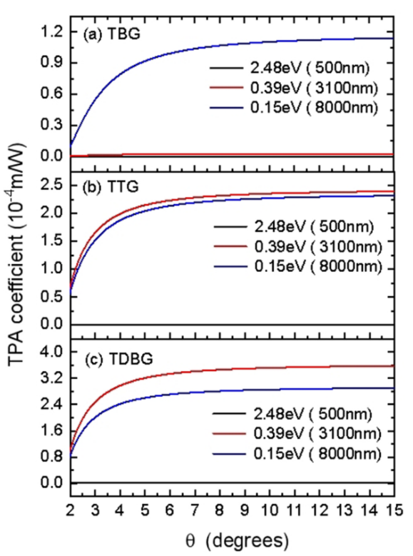 圖4. TPA系數(shù)與 (a) TBG、(b) TTG和(c) TDBG的三種不同入射波長(zhǎng)的扭轉(zhuǎn)角的關(guān)系。