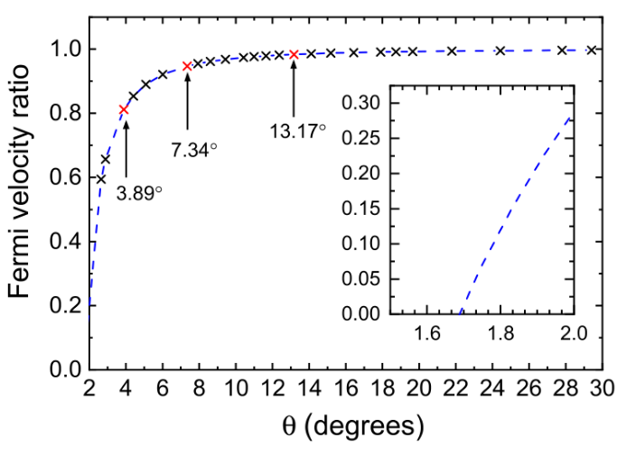 圖5. 在連續(xù)角2°< θ < 30°范圍內(nèi),費(fèi)米速度比~vF/vF隨扭轉(zhuǎn)角的變化曲線。獨(dú)立交叉表明扭轉(zhuǎn)角相稱。交叉插圖:小角度范圍內(nèi)的費(fèi)米速度比。