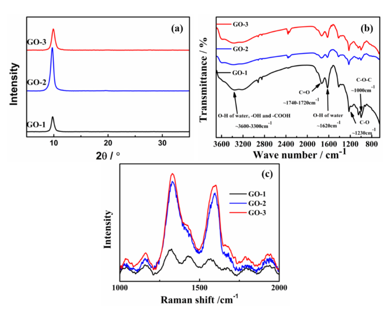圖3. 不同氧化度的GO的(a) XRD、(b) FTIR和(c)拉曼光譜。