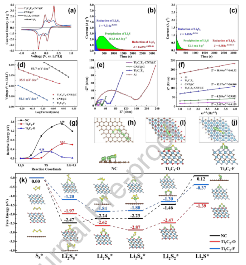 x-CNT@C和CNT@C電池在2.05 V的恒電位放電曲線。(d) 二次陰極還原過程的Tafel圖。(e)不同膜的電池EIS光譜,(f) Z1與ω−0.5在低頻區(qū)的關(guān)系。(g) Li2S在n -石墨烯、Ti