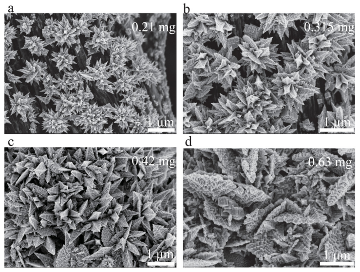 Figure 3. 制備的 Pd-nanoarray@CP 電極的 SEM 圖像,催化劑負(fù)載量為 a) 0.21 mg,b) 0.315 mg,c) 0.42 mg,d) 0.63 mg。