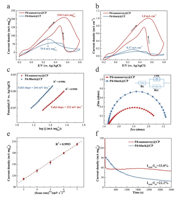 4 + 0.5 M HCOOH中測(cè)量0.3 V 的 HCOOH 溶液并使用等效電路模型進(jìn)行分析;e) Pd-nanoarray@CP電極的峰值電流密度與掃描速率平方根的關(guān)系; f) 在 0.4 V 的 0.1 M H