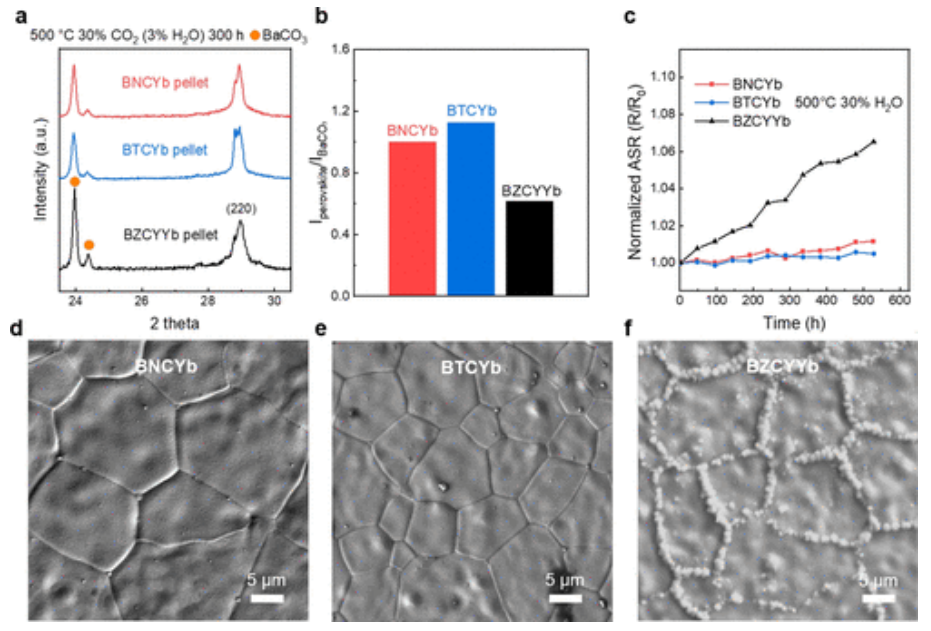 2O 的 Ar 500 小時(shí)后的電阻變化。(d-f) (d) BNCYb、(e) BTCYb 和 (f) BZCYYb 顆粒在500℃下暴露于30% H