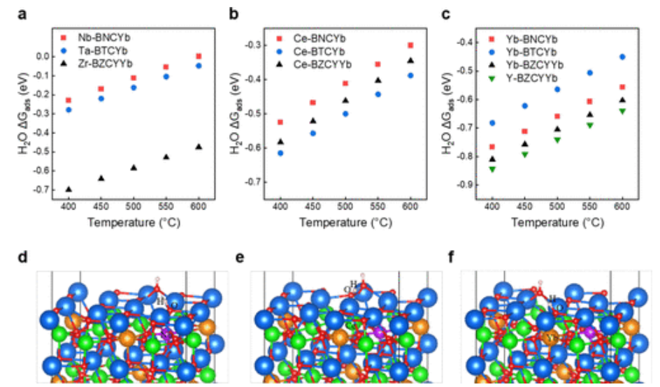 ads ) 與溫度的函數(shù)關(guān)系,(b) Ce 是 M 的最近鄰, (c) Yb/Y 是 BNCYb、BTCYb 和 BZCYYb 中 M 的最近鄰。BaO 封端的 BNCYb (001) 表面在 (d) Nb、(e) Ce 和 (f) Yb 上的 H