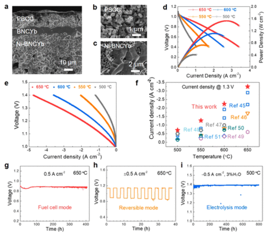 2O)。(f) 500–650℃質(zhì)子傳導(dǎo)電解池在 1.3 V 時(shí)的電流密度比較。(45−51)(g-i) Ni-BNCYb/BNCYb/PBCC 單電池在 (g) 燃料電池模式下的長期穩(wěn)定性,燃料電極中 H