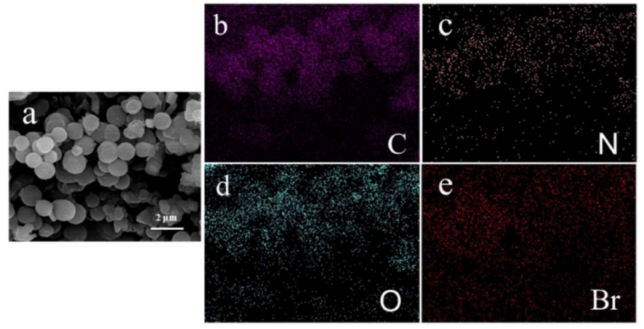 Figure 2. (a) IL-COF 的 EDS 映射和 (b) 碳、(c) 氮、(d) 氧和 (e)溴的元素分布。