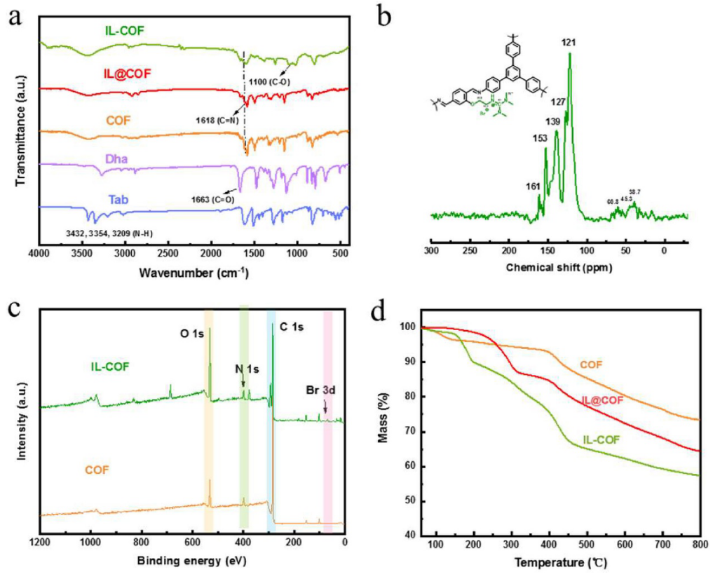 Figure 4. (a)單體Tab、Dha、COF、IL-COF 和 IL@COF的 FTIR 光譜。(b) IL-COF 的13 C 交叉極化魔角旋轉(zhuǎn) (CP/MAS) 固態(tài) NMR 光譜。(c) COF 和 IL-COF 的XPS結(jié)合能峰。(d) COF、IL-COF和IL@COF在N