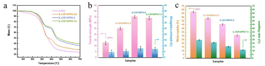 Figure 7. (a) GPPO 和 IL-COF/GPPO-X 的 TGA 曲線。(b) GPPO 和 IL-COF/GPPO-X 的機械性能。(c) GPPO 和 IL-COF/GPPO-X 在 30℃時的吸水率和溶脹率。