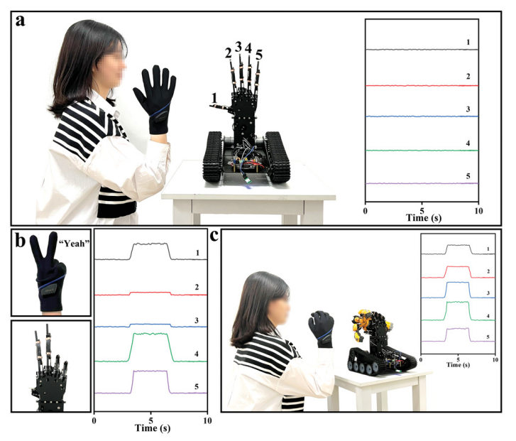 Figure 5. a) 柔性表皮傳感器附著在機械手的手指上,當(dāng)志愿者佩戴無線體感手套進(jìn)行感應(yīng)時,由志愿者的手進(jìn)行無線控制 b) 手指彎曲以展示“是”的手勢和 c) 顯示機器人的抓握。