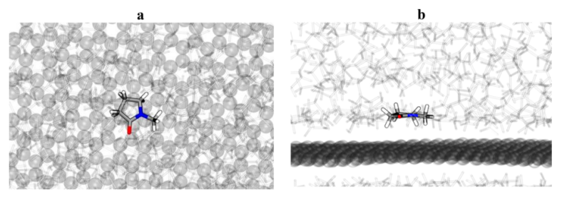 圖4.溶劑分散效果的實(shí)驗(yàn)評價。對于每種實(shí)驗(yàn)測試的溶劑: 環(huán)戊酮(CPN)、丙酮(DMF)、1,3-二甲基-2-咪唑啉酮(dMI)、 N- 甲基吡咯烷酮(NMP)、2-吡咯烷酮(PRL)。(a)描述石墨烯表面溶劑取向的指紋(詳見圖2和支持信息)。(b)統(tǒng)計(jì)拉曼分析表示為三維熱圖,其中黃色表示較高的樣本群體,灰色表示由石墨樣本占據(jù)的區(qū)域。(c)剪切混合和離心后的溶劑瓶照片; 圖像下給出了溶劑中石墨烯片的濃度。測試。