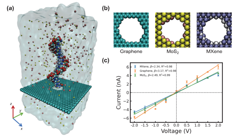 圖1、(a)單鏈 DNA 和石墨烯納米孔 MD 模擬系統(tǒng)示意圖。(b)比較了石墨烯、 MoS