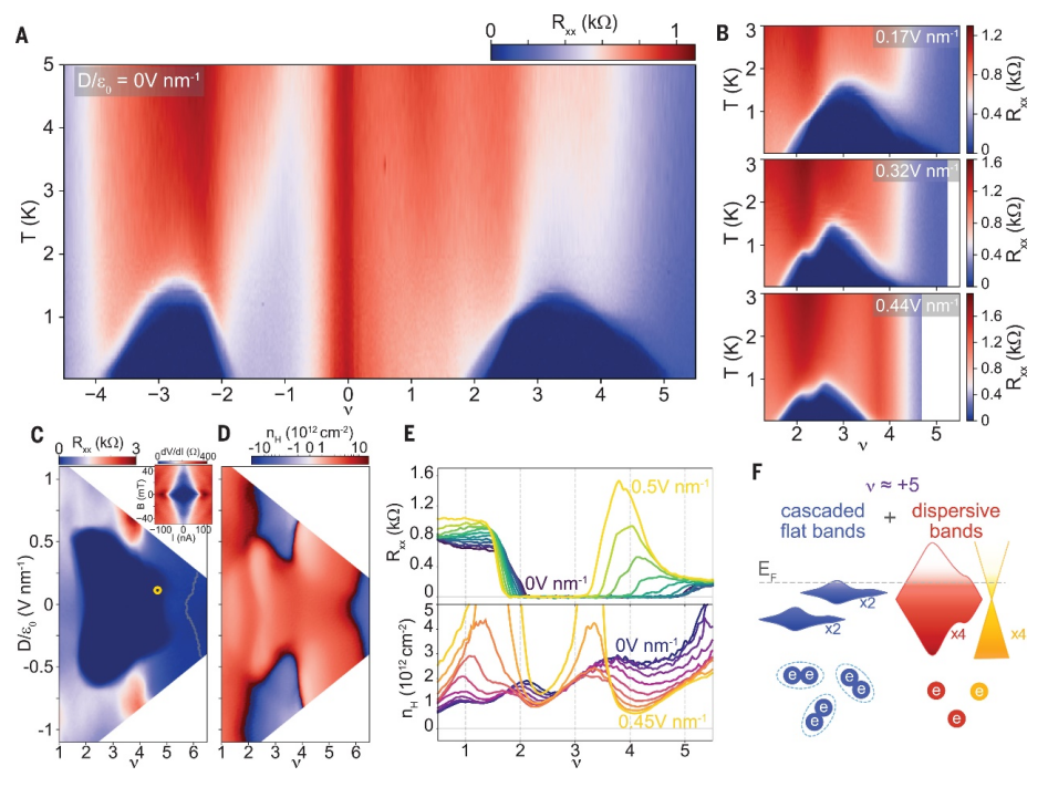 Figure 4. TPG中擴展的超導(dǎo)pockets。(A) 扭曲五層石墨烯的Rxx與ν和零D場溫度的關(guān)系。(B) Rxx與D/ε0=0:17、0:32和0:44 Vnm