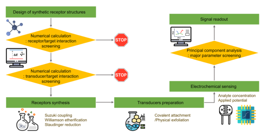 圖1. 用于高選擇性殺菌劑檢測(cè)的新型 CRs 和石墨烯納米傳感器的設(shè)計(jì)、篩選和合成/制備工藝流程。