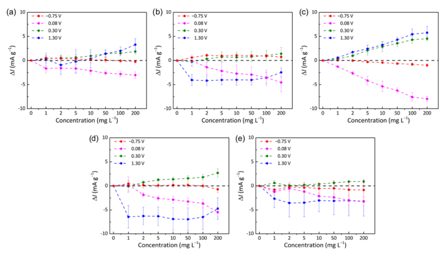 圖8. 由五個(gè)CGNH電極陣列組成的電化學(xué)傳感器平臺(tái)的傳感性能。(a)作為在0.08 V電勢(shì)(相對(duì)于Ag/AgNO