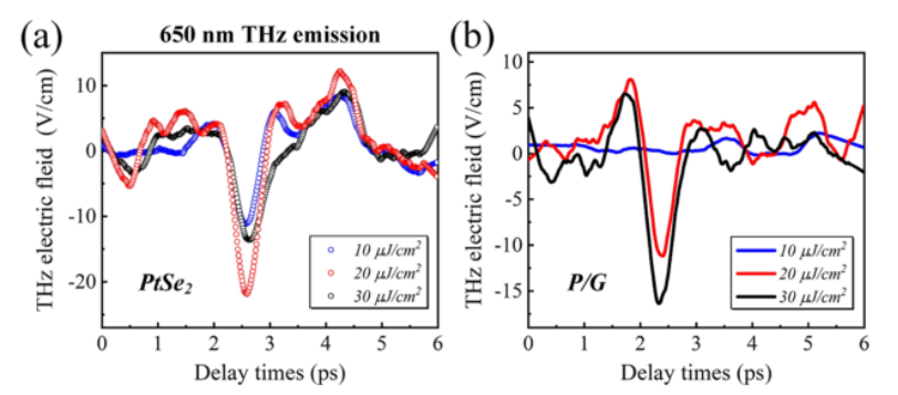 2和(b) P/G異質(zhì)結(jié)構(gòu)在650 nm波長不同泵浦能量密度下輻射的太赫茲脈沖電場強度。