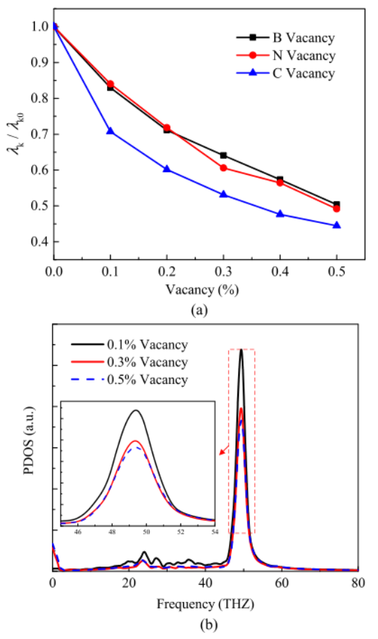 圖4 .(a)不同空位濃度下GBN vdW異質(zhì)結(jié)構(gòu)的相對(duì)TC。(b)石墨烯層的PDOS。