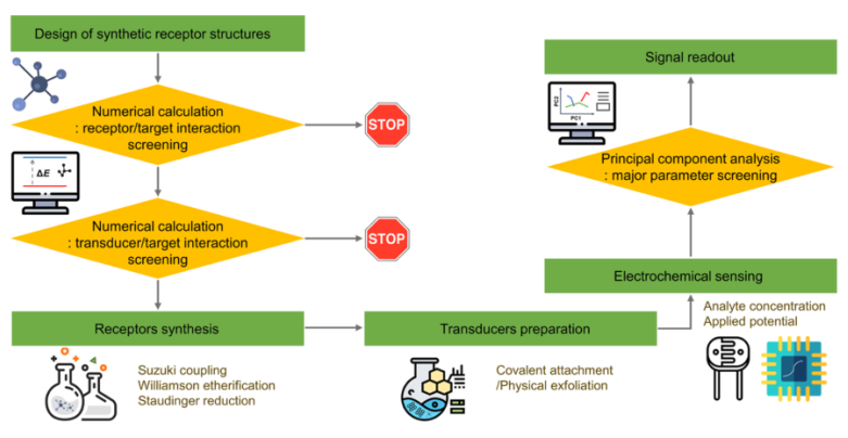 圖1. 用于高選擇性殺菌劑檢測(cè)的新型 CRs 和石墨烯納米傳感器的設(shè)計(jì)、篩選和合成/制備工藝流程。