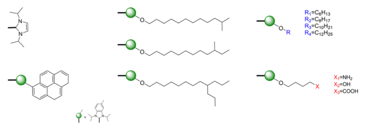 圖5. (a) 1,3-二異丙基-5-(芘基)-1H-苯并[d]咪唑碘化物(2),(b) 1,3-二異丙基-5-(十二烷氧基)-1H-苯并[d]咪唑碘化物(3)/1,3-二異丙基-5-(己氧基)-1H-苯并[d]咪唑碘化物(4),和(c) 1,3-二異丙基-5-(氨基丁氧基)-苯并[d]咪唑碘化物(5)的合成。