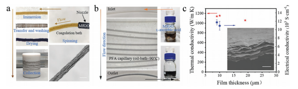 圖5。a)通過PFA毛細(xì)管對(duì)MfGO纖維進(jìn)行微流控組裝和掃描電鏡成像。b)用l-AA在PFA毛細(xì)管中微流控還原MfGO。c)由MfGO制成的薄膜的熱、電導(dǎo)電性和掃描電鏡圖像