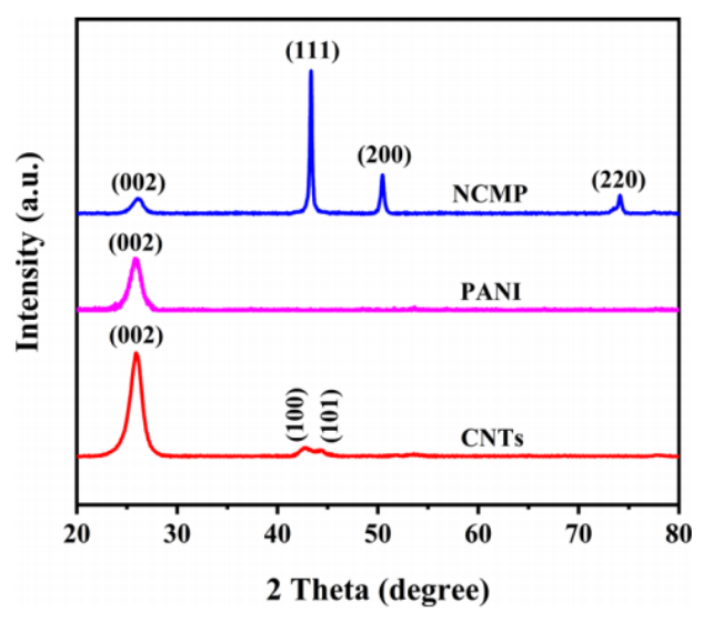 圖2. CNTs、PANI和NCMP的XRD圖譜。