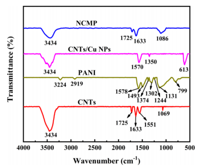 圖3 CNTs、PANI、CNTs/Cu NPs和NCMP的紅外數(shù)據(jù)分析。