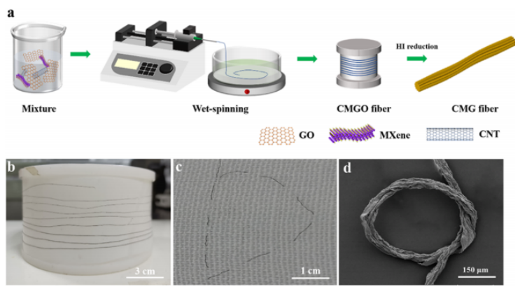 圖1 (a) CMG纖維的制作工藝示意圖。(b)收集的CMG纖維的數(shù)字照片。(c)用CMG纖維刺繡的字母“D”的數(shù)碼照片。(d) CMG纖維結(jié)的掃描電子顯微鏡(SEM)圖像。