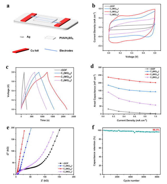 圖5。(a) CMG FSSCs和其他已報(bào)道的碳基固態(tài)FSSCs的Ragone圖。(b) C1(MG)