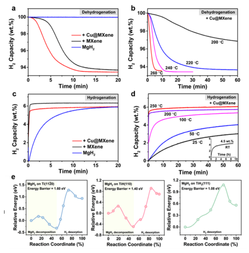 2分別在Cu@MXene和MXene催化下在250℃的等溫加氫曲線。(d)不同溫度下Cu@MXene催化MgH