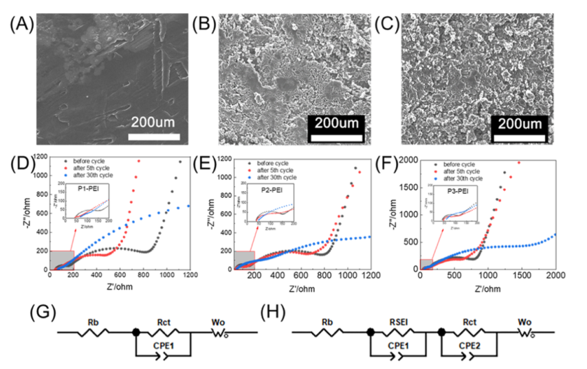 2 電池鋰金屬拆解的 SEM:(A-C) 分別為循環(huán)前、第 1 次循環(huán)后和第 30 次循環(huán)后的鋰金屬。 具有 (D) P1-PEI、(E) P2-PEI 和 (F) P3-PEI 隔膜的 Li-O