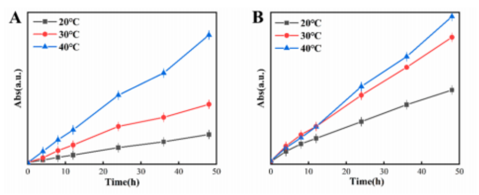 圖5 溫度對(duì)(A) IL-PF6-C4-Ms和(B) MXenes反應(yīng)過程的影響。