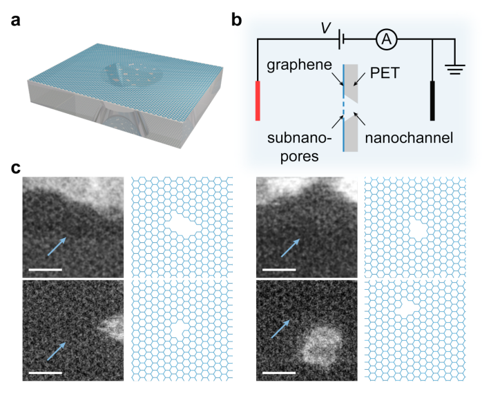 圖1. 石墨烯異質(zhì)納米通道結(jié)構(gòu)示意與石墨烯亞納米孔掃描透射電子顯微鏡圖像。