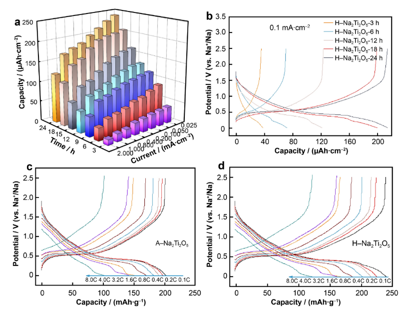 圖4. (a)不同電流密度下的比容量和(b)不同水熱時(shí)間下H-Na